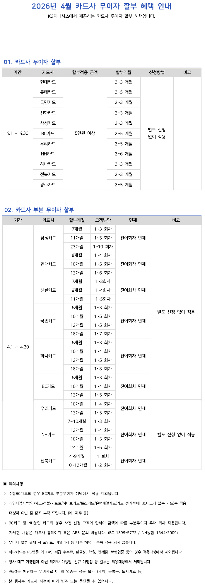 | 제 목 | 2026년 4월 카드사별 무이자 할부안내 | ||