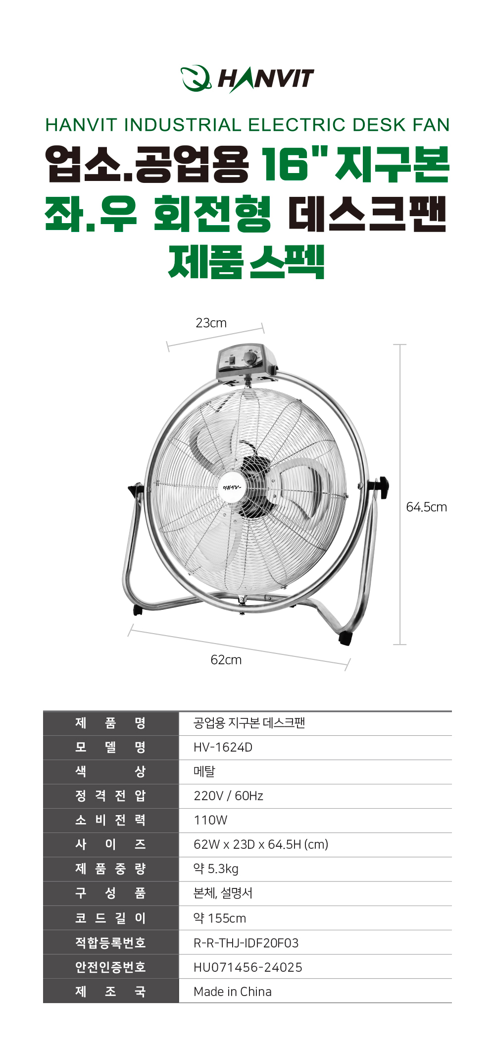 한빛 지구본데스크팬본체좌우회전(16인치)부가세포함,무료배송